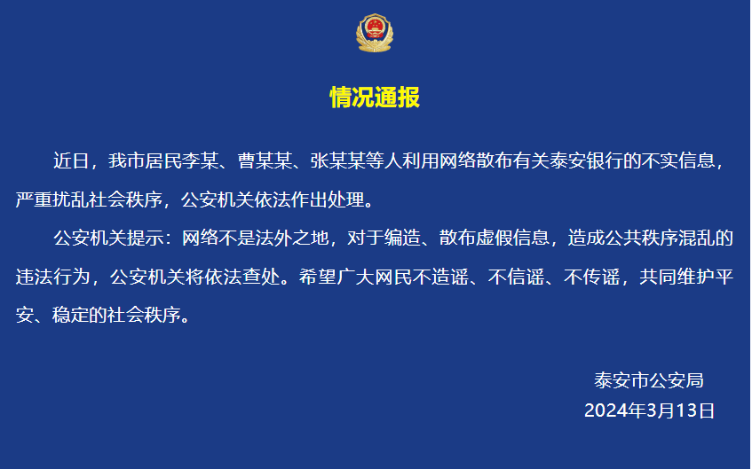 同日,泰安市公安局公告称,李某、曹某某、张某某等人利用网络散布有关泰安银行的不实信息,严重扰乱社会秩序,公安机关依法作出处理。
