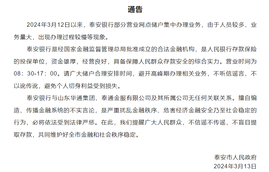 泰安市政府公告称,2024年3月12日以来,泰安银行部分营业网点储户集中办理业务,由于人员较多、业务量大,出现办理过程较慢等现象。泰安银行是经国家金融监督管理总局批准成立的合法金融机构,是人民银行存款保险的投保单位,资金雄厚,经营良好,具备保障人民群众存款安全的综合实力。