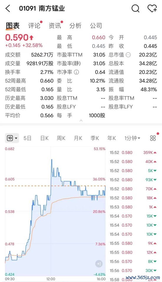 5月8日,南方锰业大涨超32%,收盘报0.59港元,成交5263万港元。