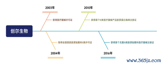 创尔生物创立于2002年,宣称其是中国胶原贴敷料产品的开创者,主要产品有胶原贴敷料、胶原蛋白海绵、医用冷敷敷料以及医学护肤品等。