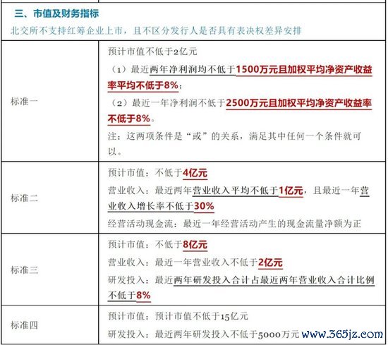 二是对市值以及财务指标的要求,主要有四套标准,发行人要在北交所上市,至少要满足四套标准中的一套。